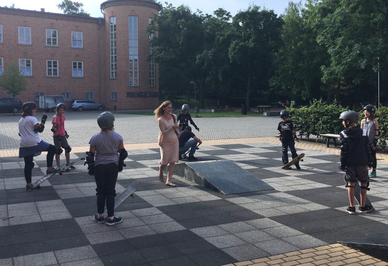 Für die Südseite der Schule wurde der hallesche Bildhauer Richard Horn beauftragt 27 figürliche Darstellungen in farbig glasierter Keramik anzufertigen, die dann als Schmuckelemente verbaut wurden. Die Darstellungen sollten kindgerecht umgesetzt werden. Auch die Wandbrunnen im Inneren der Schule, als auch die große Uhr an der oberen Wandfläche der Außenfassade wurden von Horn gestaltet. Ebenso versah er die beiden runden Treppentürme an der Front des Gebäudes mit Reliefs, die handwerkliche Berufe zeigen, um den Schülern Perspektiven aufzuzeigen und eine Auseinandersetzung mit verschiedenen Berufen anzuregen. Ein besonderes Augenmerk liegt auf der von Horn geschaffenen Schuluhr. Diese hat einen Durchmesser von 2,30m. Statt der Ziffern wählte Horn zwölf in glasiertem Ton geschaffene, mit leuchtend blauen Kleidern ausgestattete, farbenfrohe Kinderfiguren. Alle Kinder zeigen entsprechend der Stunde eine typische Beschäftigung (z.B. Essen, Singen, Rechnen, Turnen, Spielen, Einkaufen, Schlafen u.a.). Diese Uhr ist die erste Uhr in gesamt Deutschland, die versucht den Tagesablauf durch die Darstellung von Tätigkeiten der Kinder zu veranschaulichen.